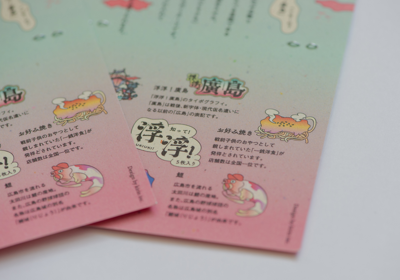 コロナ後のインバウンドや観光回復を想定し、広島に訪れたお土産品としてオリジナルカードを企画・デザインした。広島の文化や名産をモチーフに浮世絵を現代版に解釈したトーンでビジュアライズした。また、折り鶴再生紙を使用しており平和活動やSDGsの観点にも貢献した。スマホケースに入れて持ち歩けばいつでも“廣島”を感じられる。
